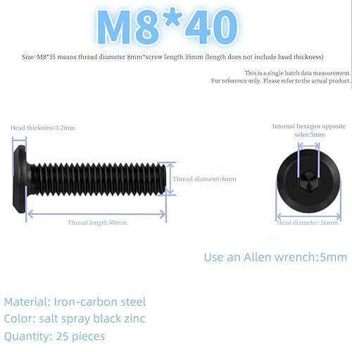 Viti a testa piatta, 25 viti M8 x 40, viti a testa bombata a esagono incassato, in acciaio al carbonio, filettatura completa in ossido nero con chiave esagonale (M8-45 mm)