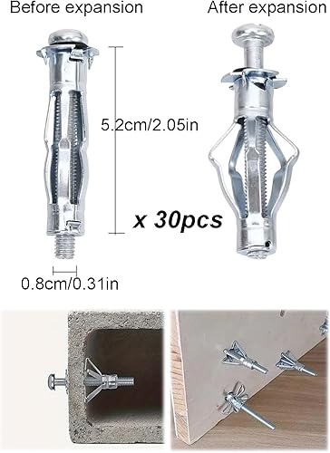 30 tasselli per cavità con viti, tasselli per cavità in metallo zincato, tasselli per parete cava M8 x 52 mm, tasselli di espansione, tasselli per cavità in metallo, per fissaggio in