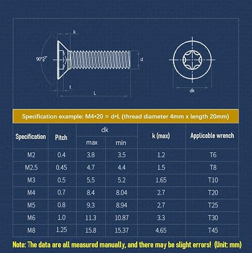 Viti Torx a Testa Svasata/Piatta, Bulloni Antifurto in Acciaio Inossidabile Viti a Brugola M2.5x5mm (100 Pezzi)