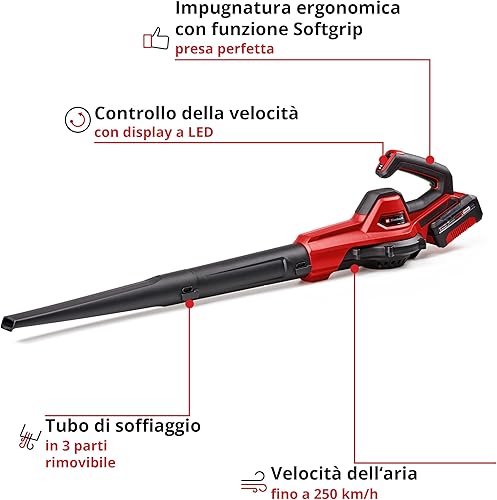 Einhell Soffiatore universale a batteria GE-UB 18/250 Li E (1x4.0 Ah) Power X-Change (18 V, velocità aria 250 km/h, tubo a 3 pezzi e controllo della velocità con display LED, senza batteria)