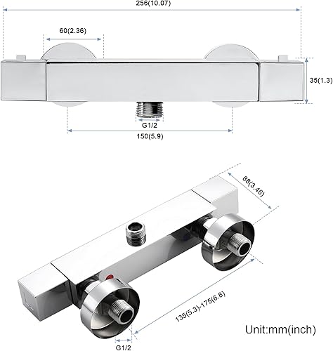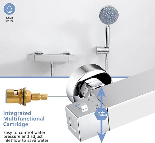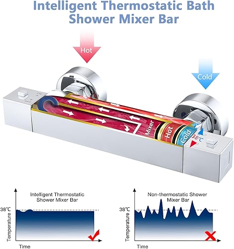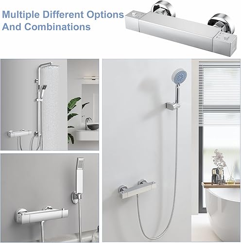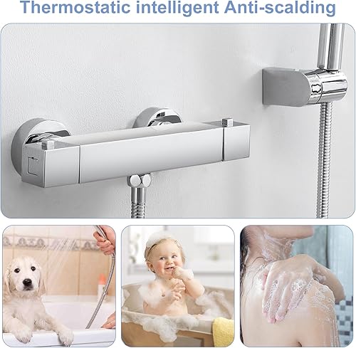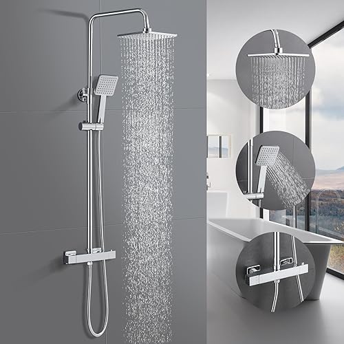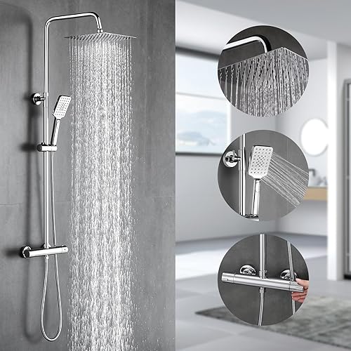 Sistema doccia con termostato, doccia a pioggia con rubinetto, in acciaio inox, set completo, set doccia con 81-117 cm, asta doccia regolabile, cromato
