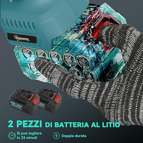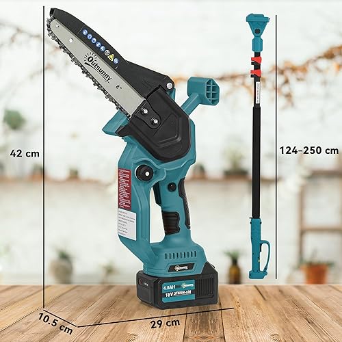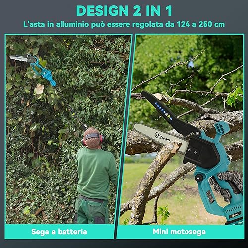 Outsunny Mini Motosega a Batterie 2 in 1 con Palo Telescopico, Motosega Senza Fili con Motore Brushless, 2 Batterie e Blocco di Sicurezza, Guanti e Occhiali di Protezione Inclusi, Blu