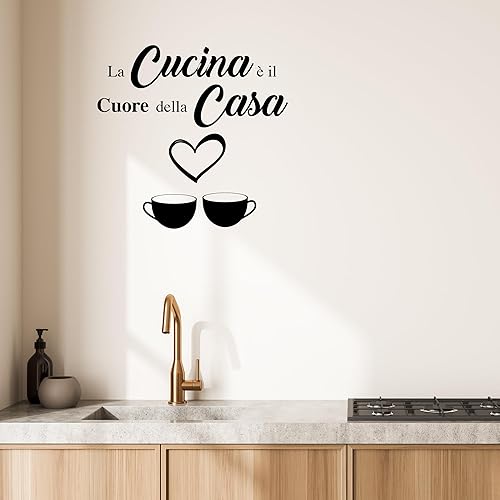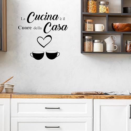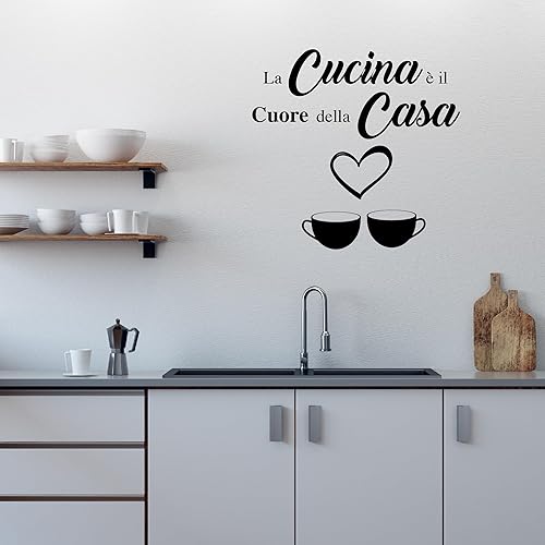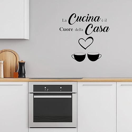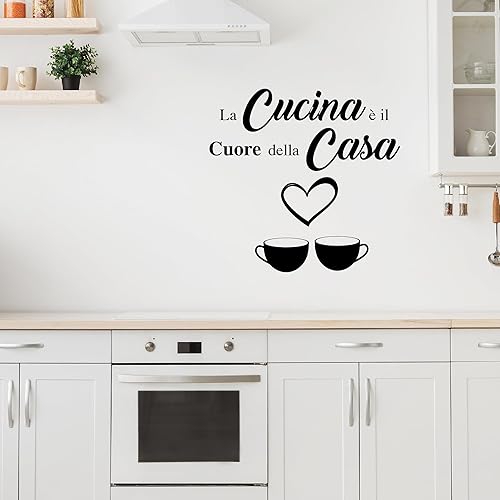 Adesivi Murali Cucina con 2 Tazzine e Cuore - Decorazioni Casa e Parete - Frase 'La Cucina è il Cuore della Casa' - Adesivi Murali Cucina per Decorazioni da Parete e Oggetti Decorativi per la Casa