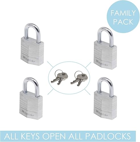 Master Lock 9120EURQNOPCC Mini Lucchetto, Chiave, Set di 4, Pacco Famiglia, Ottimo per valigia e armadietto, Argento/Alluminio, Piccolo