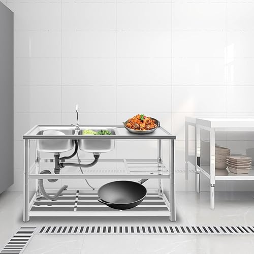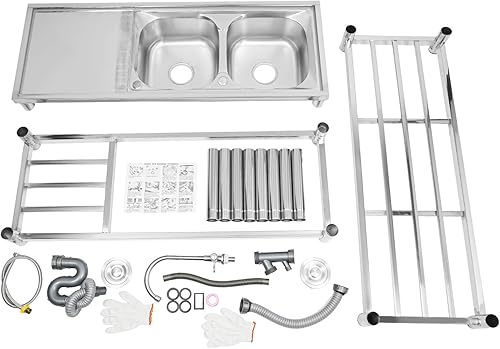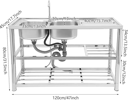 Lavello da cucina autoportante, in acciaio inox commerciale con 2 vasche da lavoro, rubinetto e scarico, doppio lavello per interni esterni, 120 x 45 x 80 cm