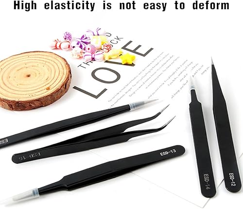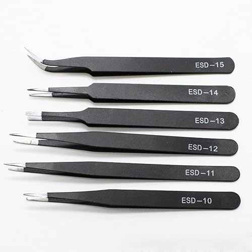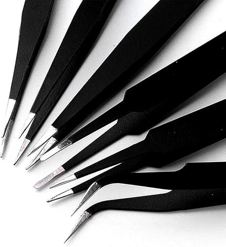 6 Pinzette di Precisione Anti-Statiche in Acciaio Inossidabile Nero, Set di 6 Pinzette di Precisione per Elettronica, Gioielleria, Laboratorio