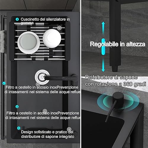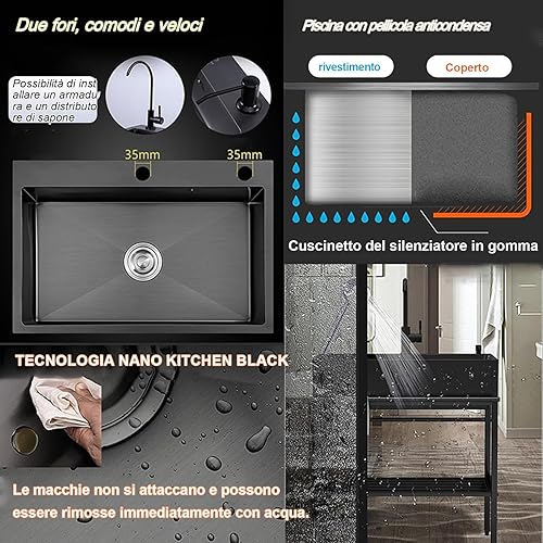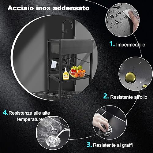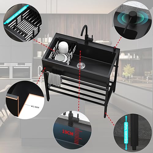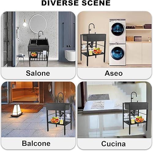 Lavello Cucina Nero con 1 vasca,Lavandino in Acciaio Inox con Scolapiatti,Lavabo con Rubinetto, Autoportante,Lavatoio da Giardino Campeggio,per Interni Esterni(50×40×86cm)
