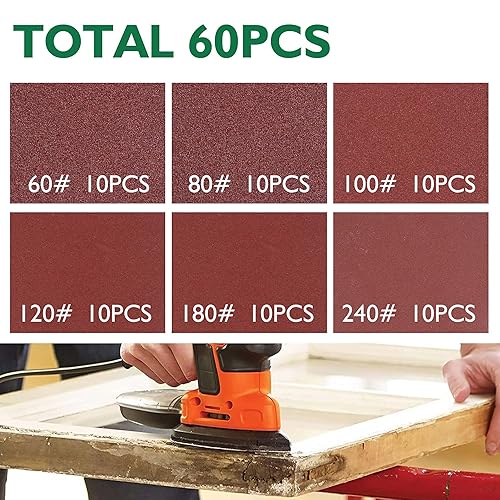 60 PCS Levigatrice per Legno 140x90 mm, 5 Fori Carta Vetrata, Levigatrice Mouse Set 10 X 60/80/100/120/180/240, Carta Abrasiva Adatto per Legno, Muro, Metallo, Auto