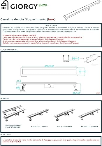 Canalina Di Scarico Per Piatto Doccia A Pavimento Acciaio Inox (110x7 cm, Linea/Piastrellabile)