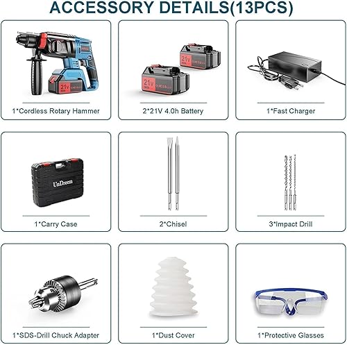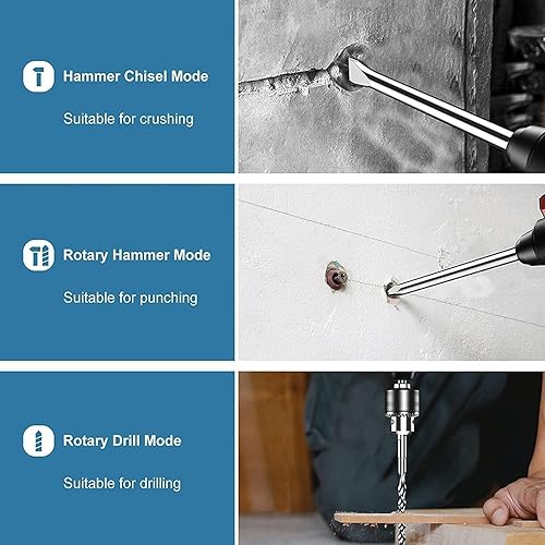 Martello Perforatore a Batteria, Martello Demolitore, Martello Tassellatore a Batteria, 4 in 1 Funzione, Adattatore SDS-plus con Mandrino, 3 Punte, 2 Scalpelli, 2 * 4000mAh Batteria