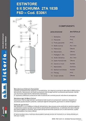 ESTINTORE SCHIUMA/IDRICO LT 6, CLASSE DI SPEGNIMENTO 27A 183B, OMOLOGATO E CERTIFICATO, FORNITO DI STAFFA+CARTELLO+ PRIMO TAGLIANDO DI CONTROLLO