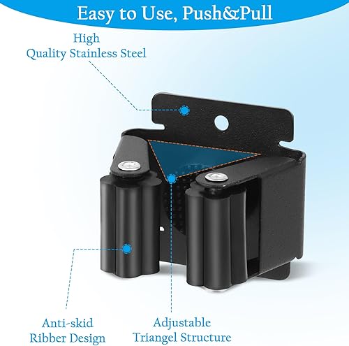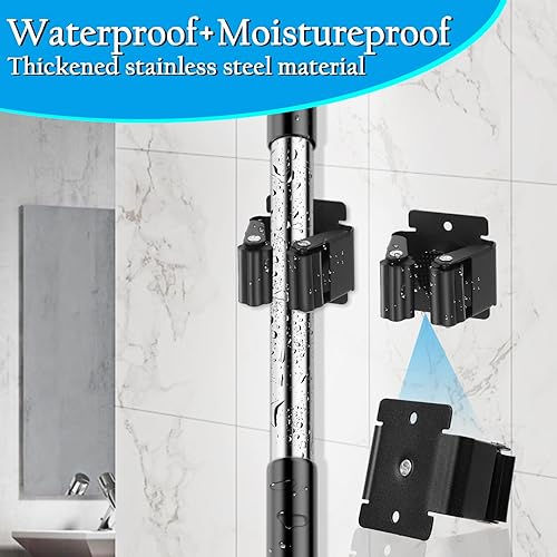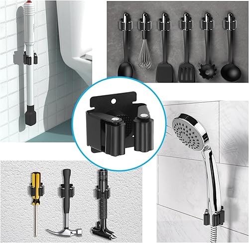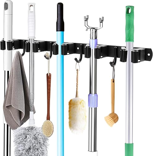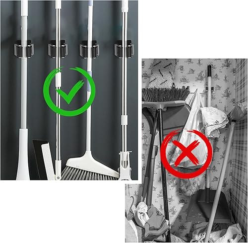 304 Porta Scope Parete in Acciaio Inox, Appendi Scopa, Porta Scope Parete con 5 Supporti e 4 Ganci Nero Portascope, Portascope da Muro per Cucina, Bagno, Garage e Giardino, Grigio (Nero)
