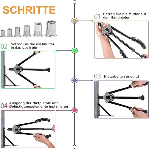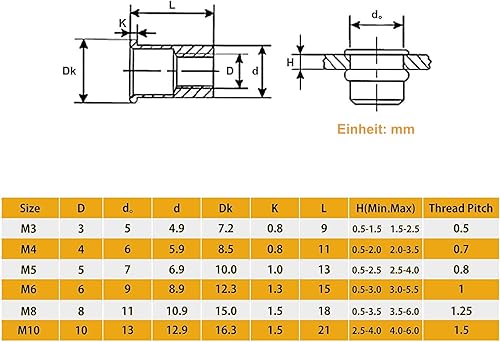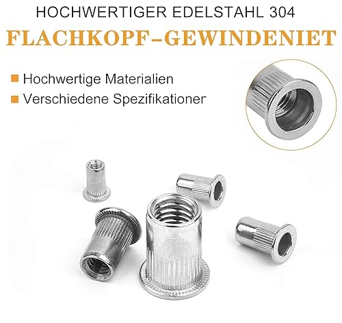 250 dadi rivetti assortiti, M3, M4, M5, M6, M8, M10, dadi filettati A2-70, in acciaio inox, testa piatta, filettatura Rivet Nutsert Cap, dadi per pinze rivetti