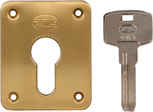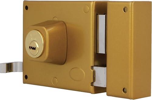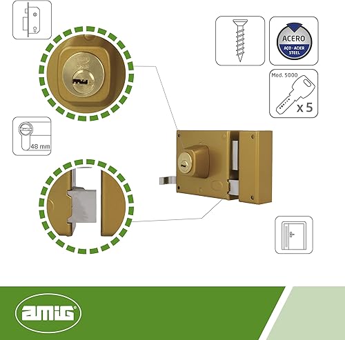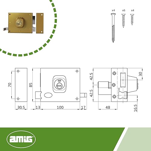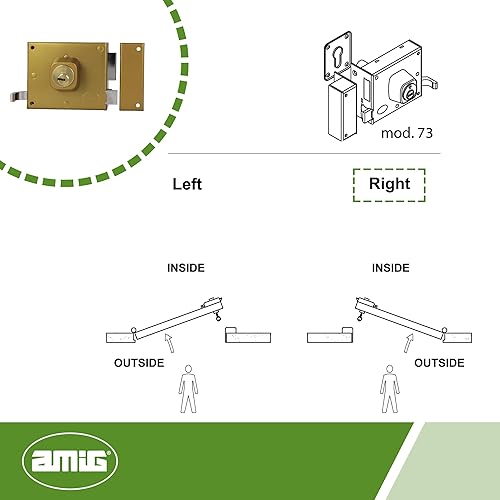 Amig - Serratura da sovrapposizione a destra con leva di chiusura, linguetta e maniglia per porte in legno mod. 73 | 100 x 85 mm | Chiusura con cilindro Europrofilo | Acciaio dorato