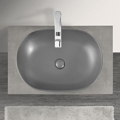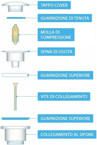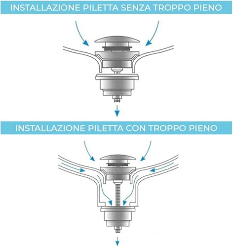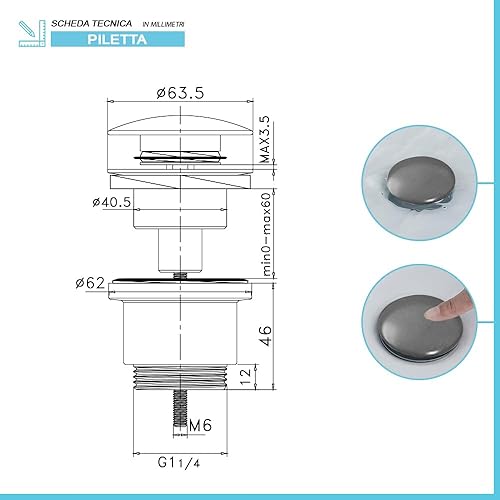 Piletta Di Scarico Universale Click Clack In Acciaio Con Tappo In Ceramica Grigio Opaco, Compatibile Sia Con Fori Troppo Pieno Che Senza