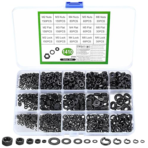 Set di 1410 rondelle in acciaio al carbonio, dadi esagonali e anelli a molla in acciaio al carbonio, M2 M3 M4 M5 M6, set di rondelle piatte (nero)
