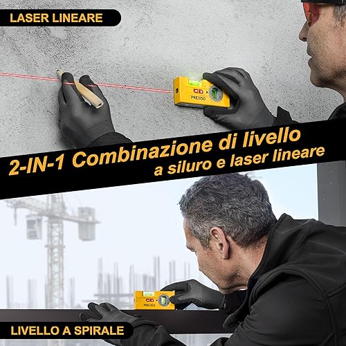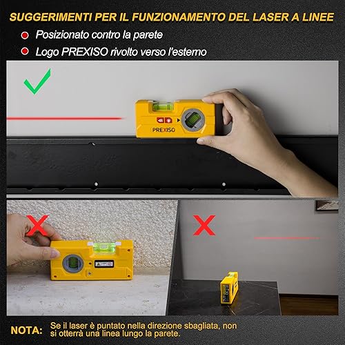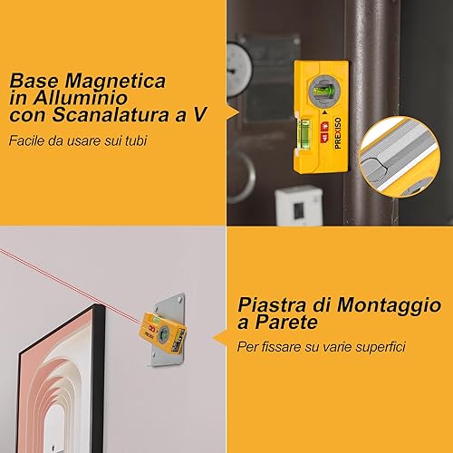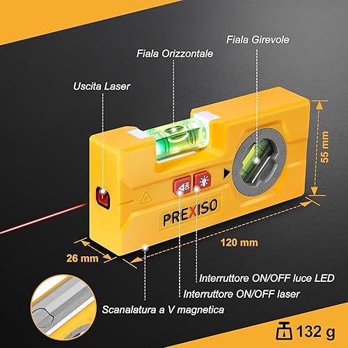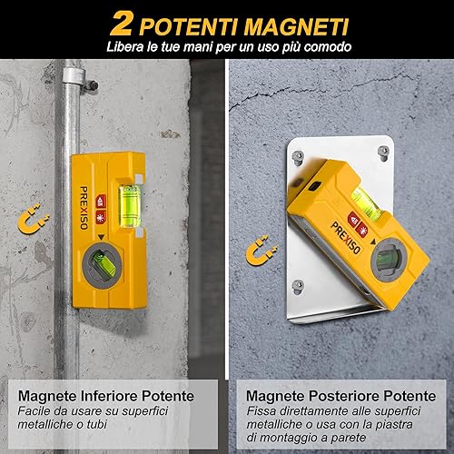 PREXISO Livella Laser 2 in 1, Livella Mini Torpedo con Luce LED, Livella Tascabile Magnetica Girevole & Livella Laser da 10 m per Appendere Quadri, Tracciare Pareti, Pittura e Decorazione della Casa