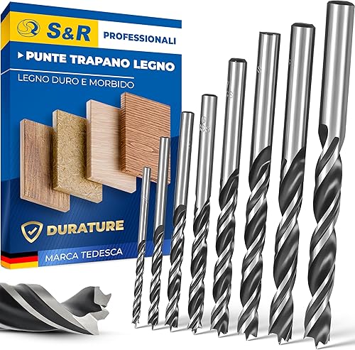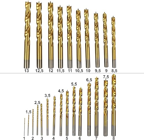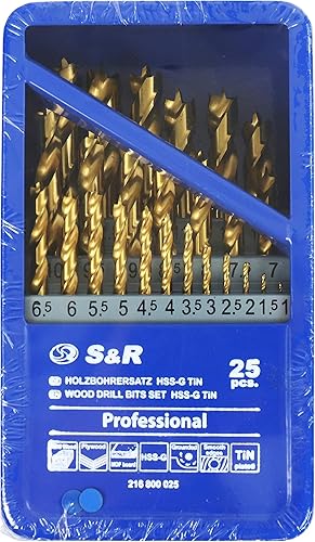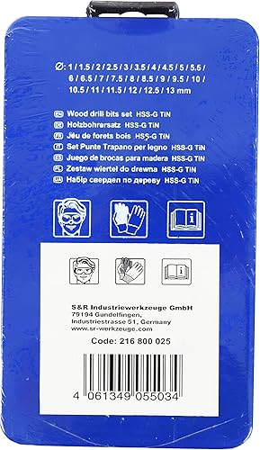 S&R 25 Punte per Legno Professionali 1-13mm in Acciaio HSS 4241, Rivestimento Tin. Punte Rettificate per fori tondi precisi. Scatola di metallo