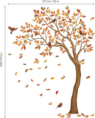 wondever Adesivi Murali Albero Grande Sticker da Muro Foglie d'Autunno Uccelli Adesivi da Parete per Soggiorno Camera da Letto (H: 170cm)