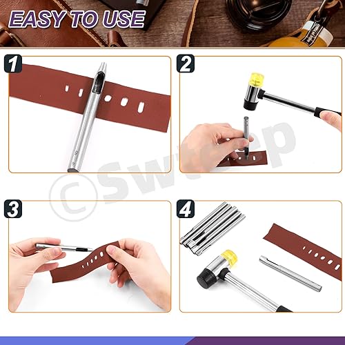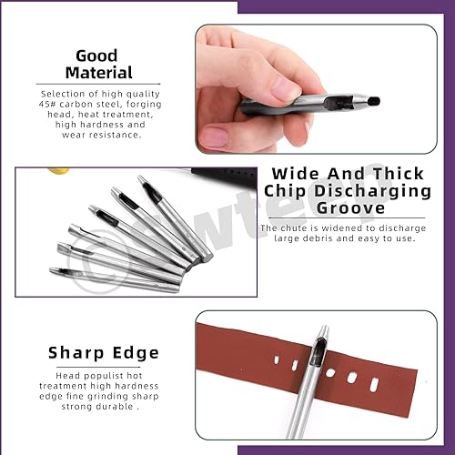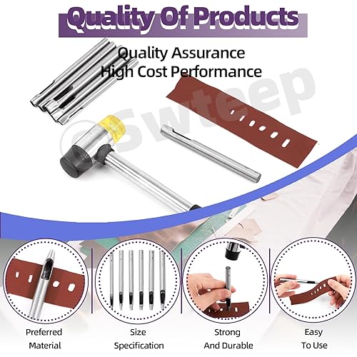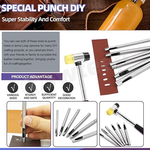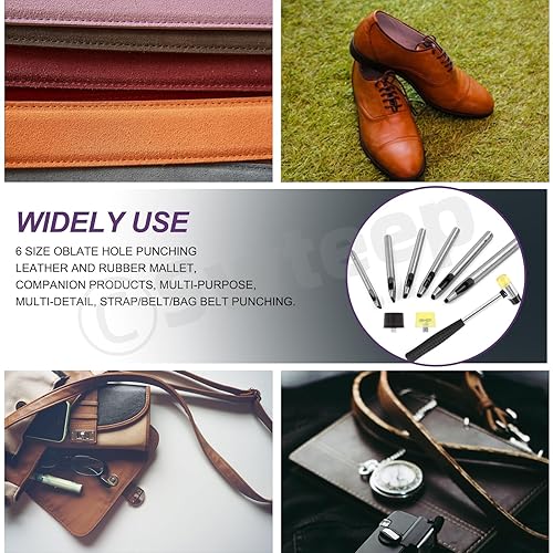 Set di 6 punch cavi in pelle, 2 – 10 mm, in pelle, ovale, foro e martello morbido a doppia faccia, punzonatura e martello in gomma, con 2 pezzi, testa di ricambio per cuoio Crafting