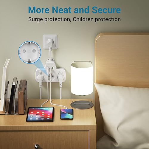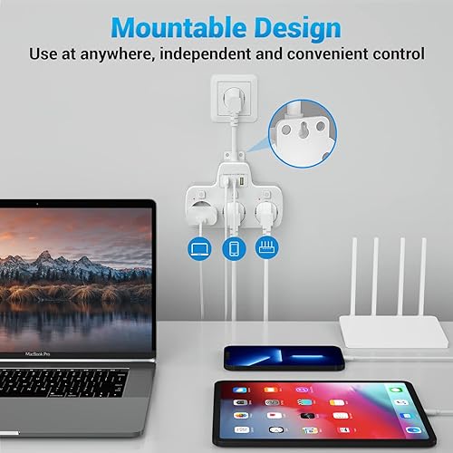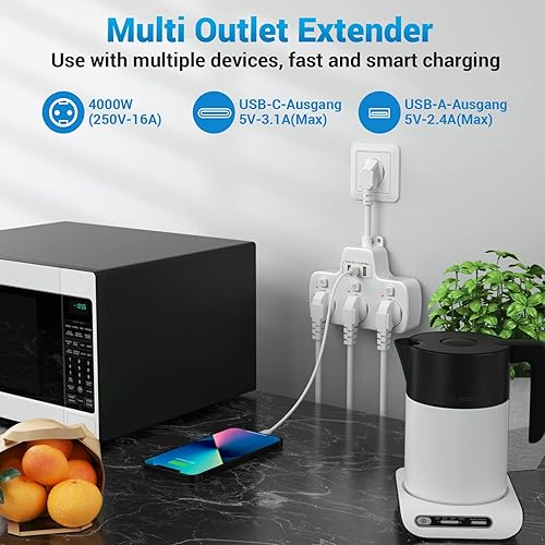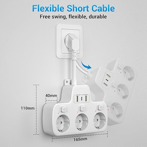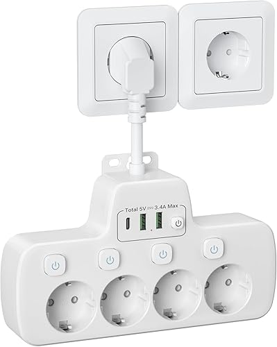 Ciabatta Multipresa con USB C,Presa Multipla Salvaspazio Ciabatta Elettrica con Interruttore 4 Presa Adattatore Schuko e 3 USB Carica Parete Multipresa da Scrivania Spina Tedesca Cavo Corto,Bianco