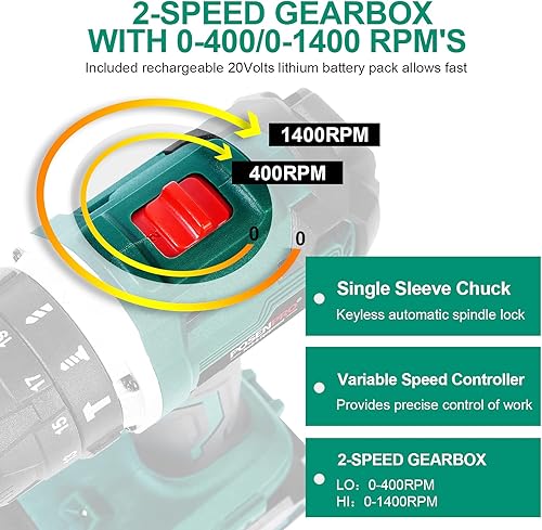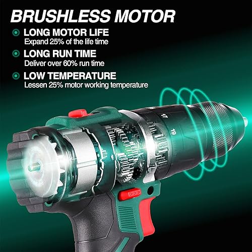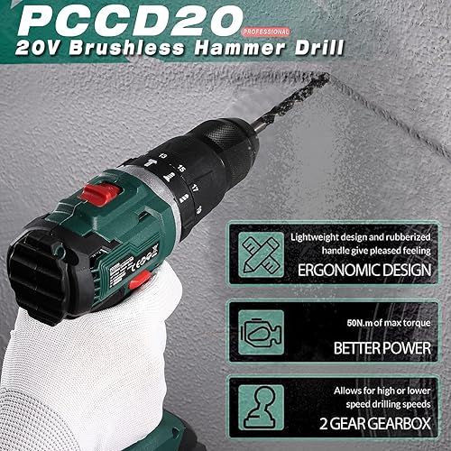 Trapano Avvitatore Batteria 20V, Brushless Avvitatore a Batteria con 2 Batterie da 2.0Ah, 50N.m di Coppia, 2 Velocità, 19+3 Coppia, Luce a LED, Trapano a Percussione da 1/2', Per il fai da te