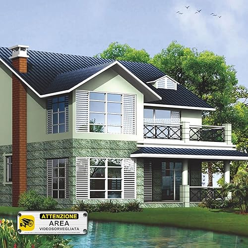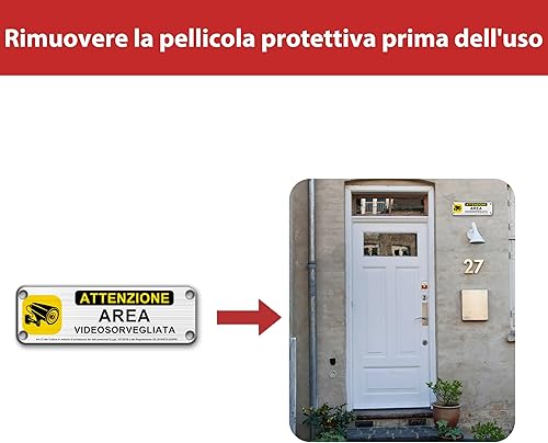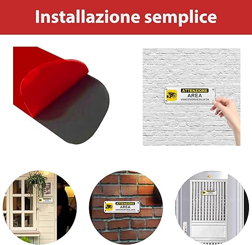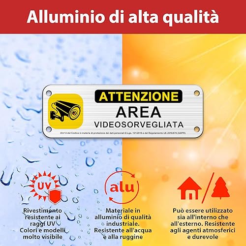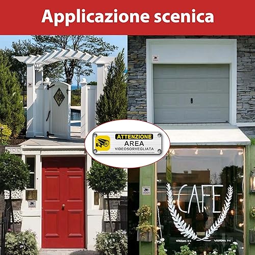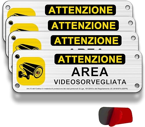 Cartello Videosorvegliata Alluminio Spazzolato 15x5cm, Adesivo Area Videosorvegliata Metallo di Piccole Dimensioni, piastra di allarme con adesivi (01-ASAV (15x5cm) x 4)
