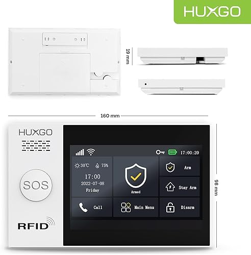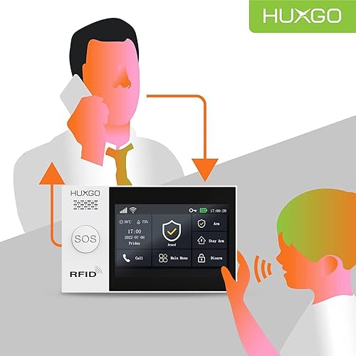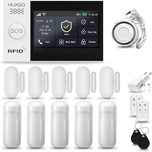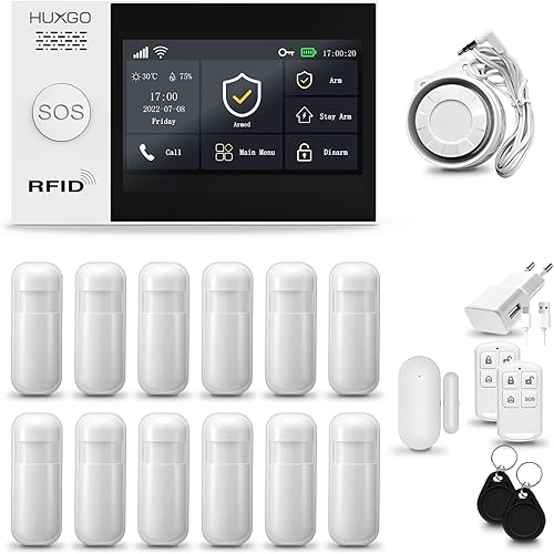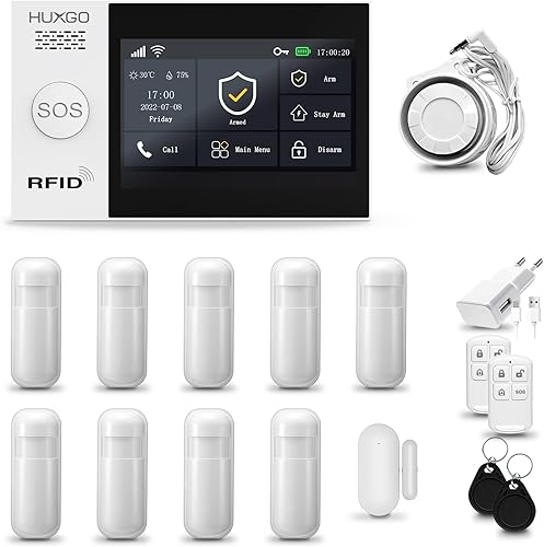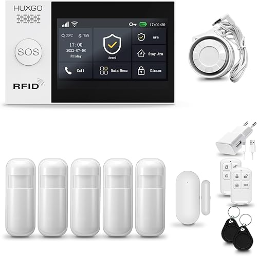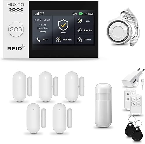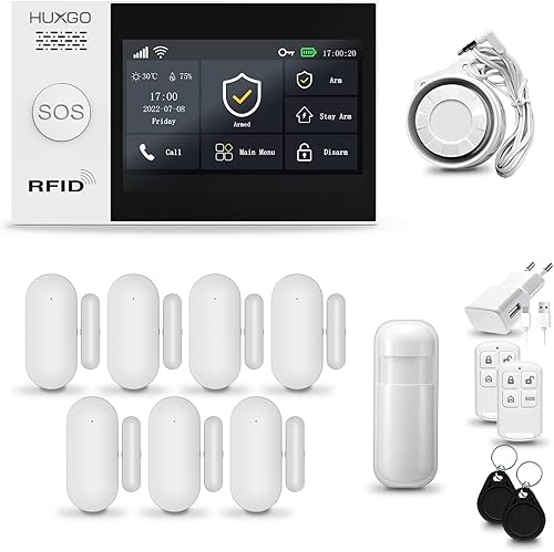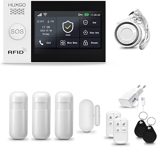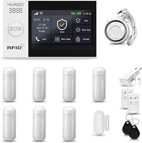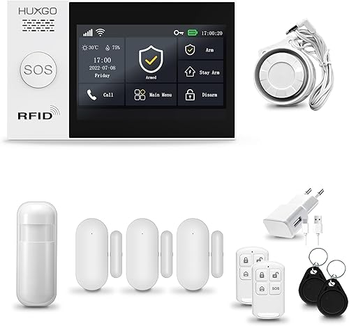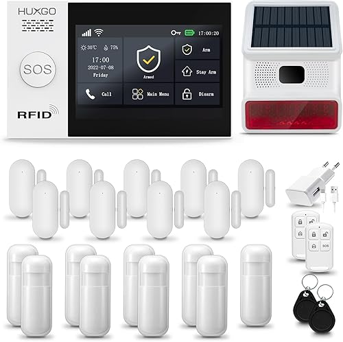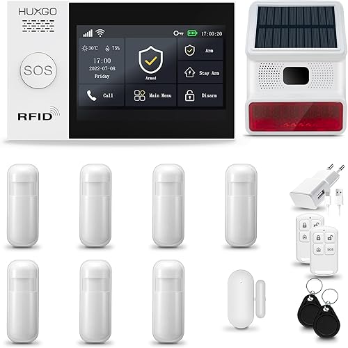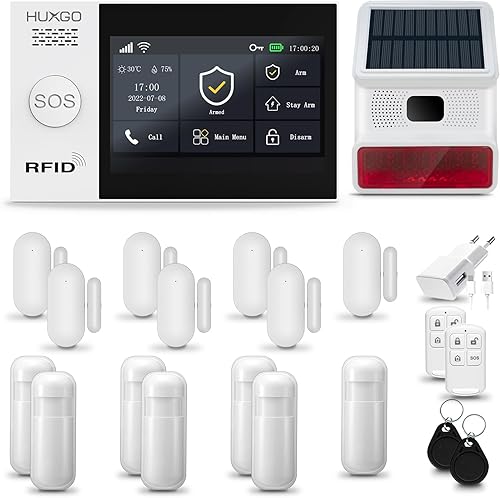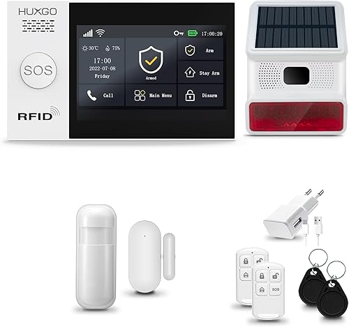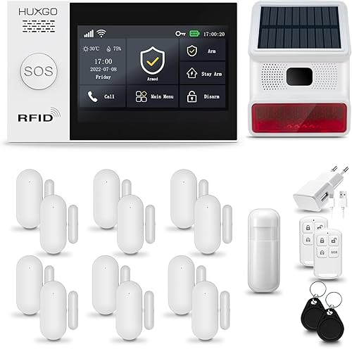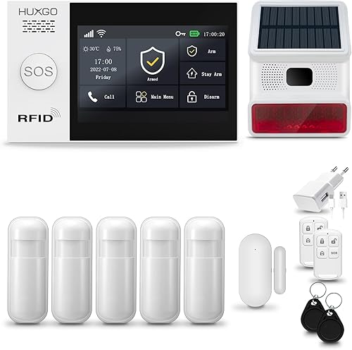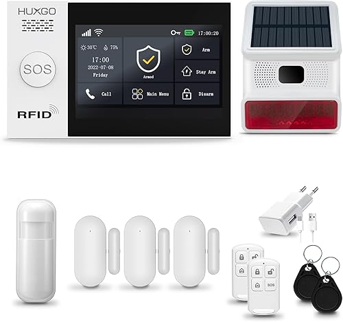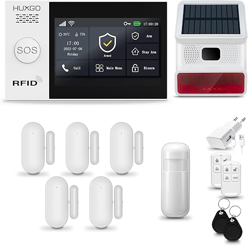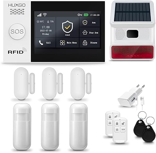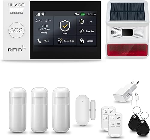 HUXGO® HXA007 Sistema di allarme casa senza fili con Radio Sirena solare WiFi + GSM 4G LTE | Impianto allarme casa kit con 1x sensori di allarme per finestre/portes, 3x rilevatori di movimento
