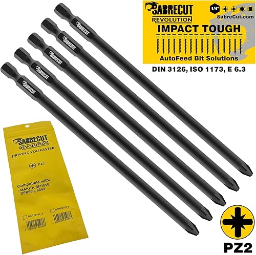 5 x SabreCut SCPZ2157_5 157 mm PZ2 autoalimentato per cartongesso, punta per pistola a punta singola PoziDriv POZI No.2 resistente compatibile con Makita BFR550 6843 DFR550