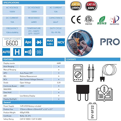 C-LOGIC 5200 Multimetro Digitale Professionale CAT IV 6600 Conti NCV Tensione DC/AC 1000 V Corrente AC/DC 10 A Resistenza 66 MΩ Temperatura Capacitanza Frequenza 20 kHz Autoscale
