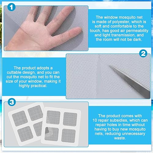 3 Rotoli Zanzariera per Finestre 1,3*1,5m con 3 Nastri Autoadesivi e 10 Riparazione per Zanzariere Zanzariera per Finestre a Rete per Bloccare Insetti Zanzare Mosche ed Altri Insetti, Bianco