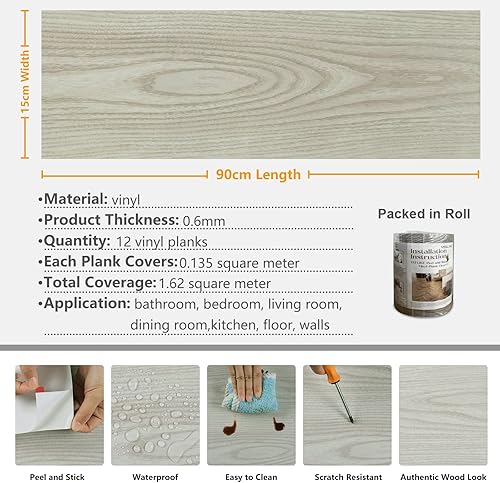 Pavimento PVC Adesivo Effetto Legno Grigia Bianco Mattonelle Adesive Cucina Piastrelle Adesive Bagno Pavimenti in PVC Rotoli Piastrelle Adesive Pavimento Impermeabile 90cm×15cm 12 Pezzi