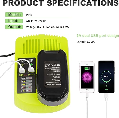 RB18L50 18V 5Ah Batteria di ricambio per Ryobi 2 pacchetti con caricabatterie a doppia porta di ricambio per Ryobi P117 12V-18V One Plus Series USB per Ryobi P107 P108 RB18L15 RB18L40
