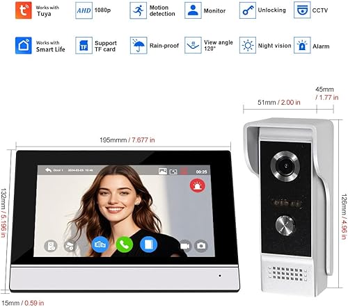 7 Pollici WiFi Colore Video Campanello Porta Sistema di Citofono 1080P AHD, Telecamera Esterna di Visione Notturna IR, Videocitofono per la Casa, Sblocco Remoto Tuya Smart APP