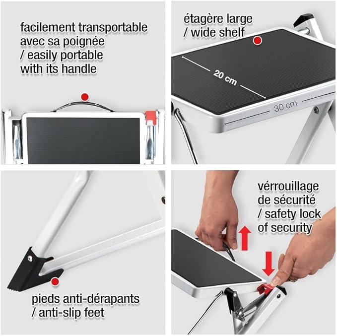 MSV, Sgabello a 2 gradini, Pieghevole, Sgabello leggero, Acciaio, Max 150 kg, Rivestimento antiscivolo dei gradini, Piedini in gomma, Compatto, 48x37x57 cm, Nero