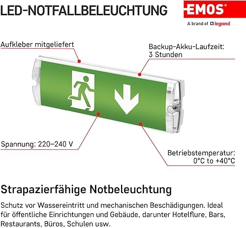 EMOS Illuminazione di emergenza a LED, luce di uscita di emergenza fino a 3 ore, modalità di emergenza con pulsante di prova manuale, batteria inclusa, lampada di emergenza per montaggio a parete,