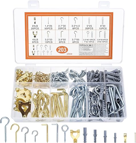 203 Pz Ganci per Quadri Muro: Ganci a Vite per Legno, Ganci Avvitabili Muro, Ganci a L Viti per Occhielli a Vite, Gancio Soffitto, Viti a Occhiello, Gancio a Vite per Appendi Quadri Tazze Parete