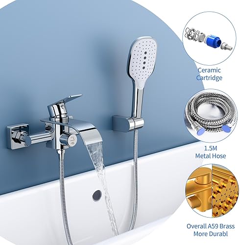 Rubinetto per vasca da bagno con doccetta a mano, rubinetto a cascata, miscelatore in ottone con 3 funzioni, rubinetto con una sola mano, vasca da bagno con interruttore a pressione
