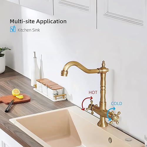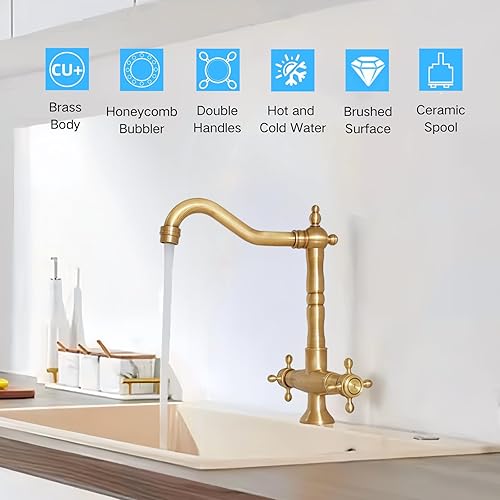 NIUKOMY Rubinetto Lavello Cucina in Ottone Antico, Retrò Miscelatore Lavabo Bagno Alto in Bronzo, Girevole a 360° Rubinetti Cucina Nostalgia a Due Maniglie