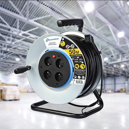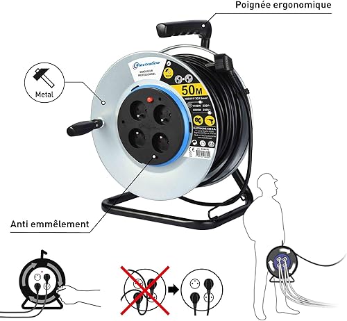 Electraline 208690 208690-Prolunga elettrica in Metallo, 50 m, 4 Prese con Guida per Il Cavo, Piastra Fissa e Impugnatura ergonomica, Grigio