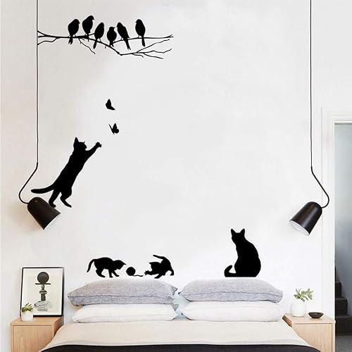 CUNYA 2 set adesivi murali neri carini, gatti che giocano e uccelli sui rami degli alberi Carta da parati murales Decorazioni per la casa per camere da letto, Soggiorno, Finestra