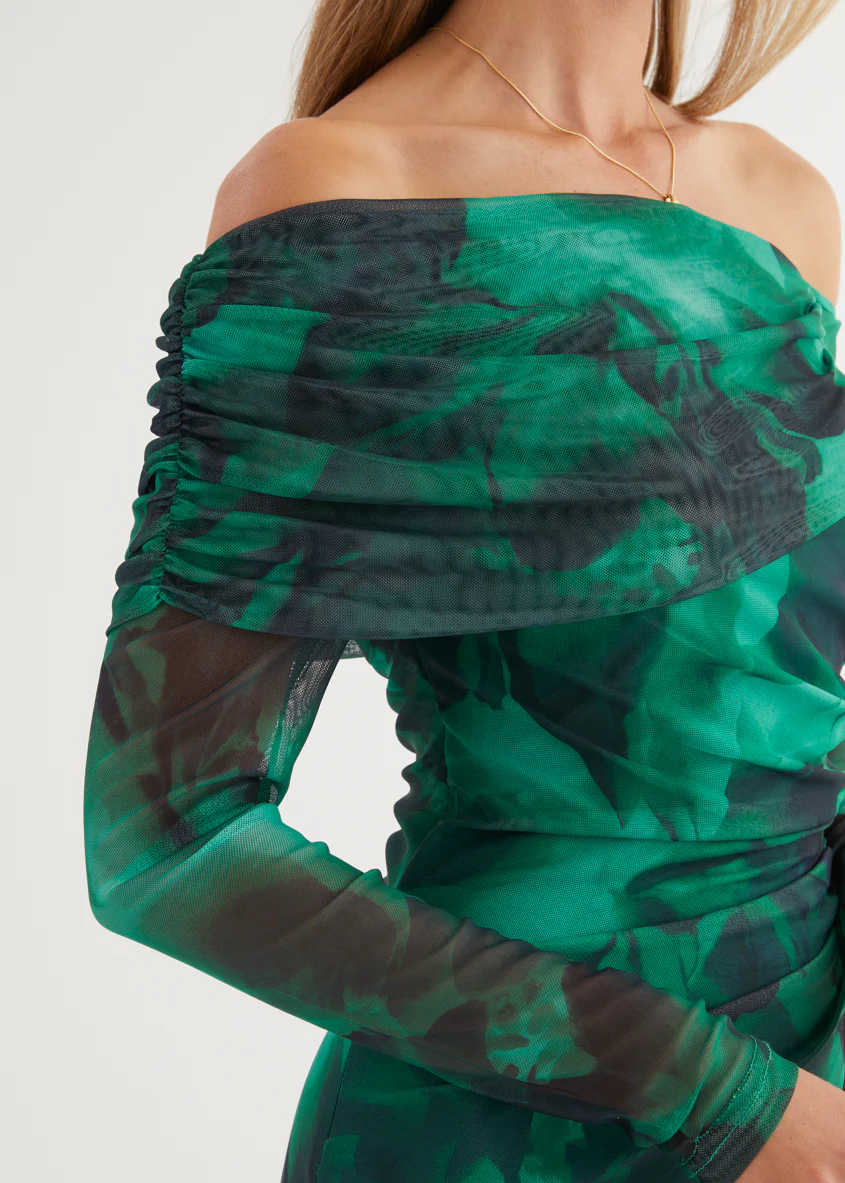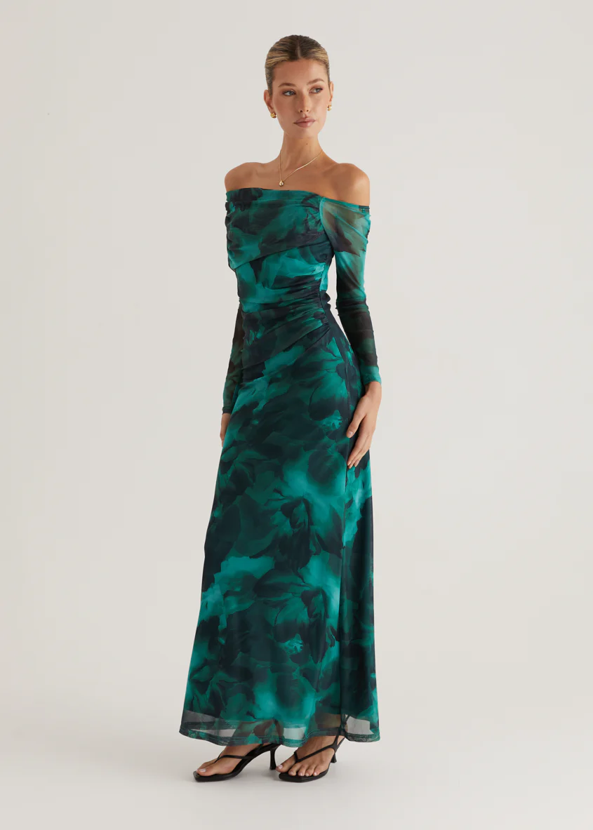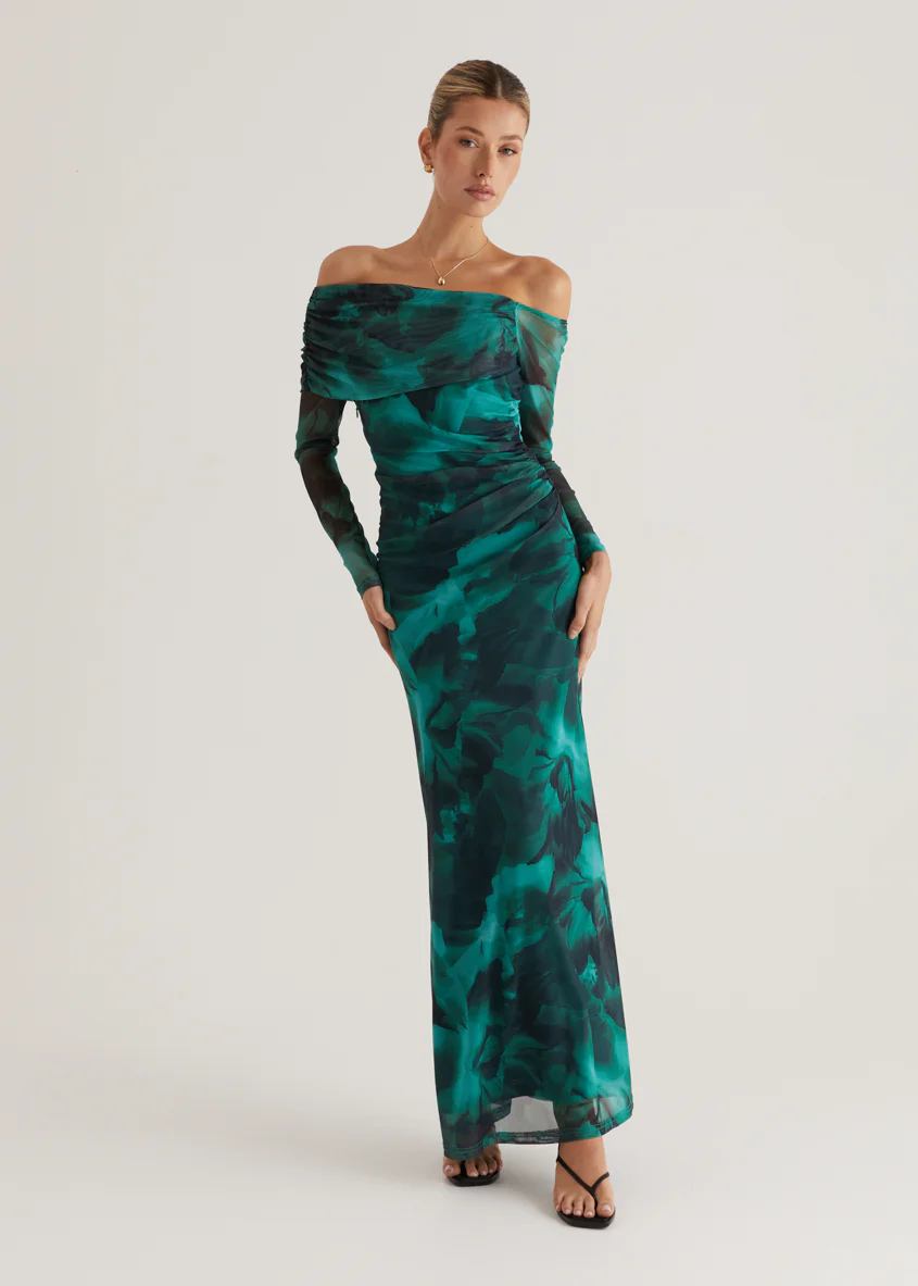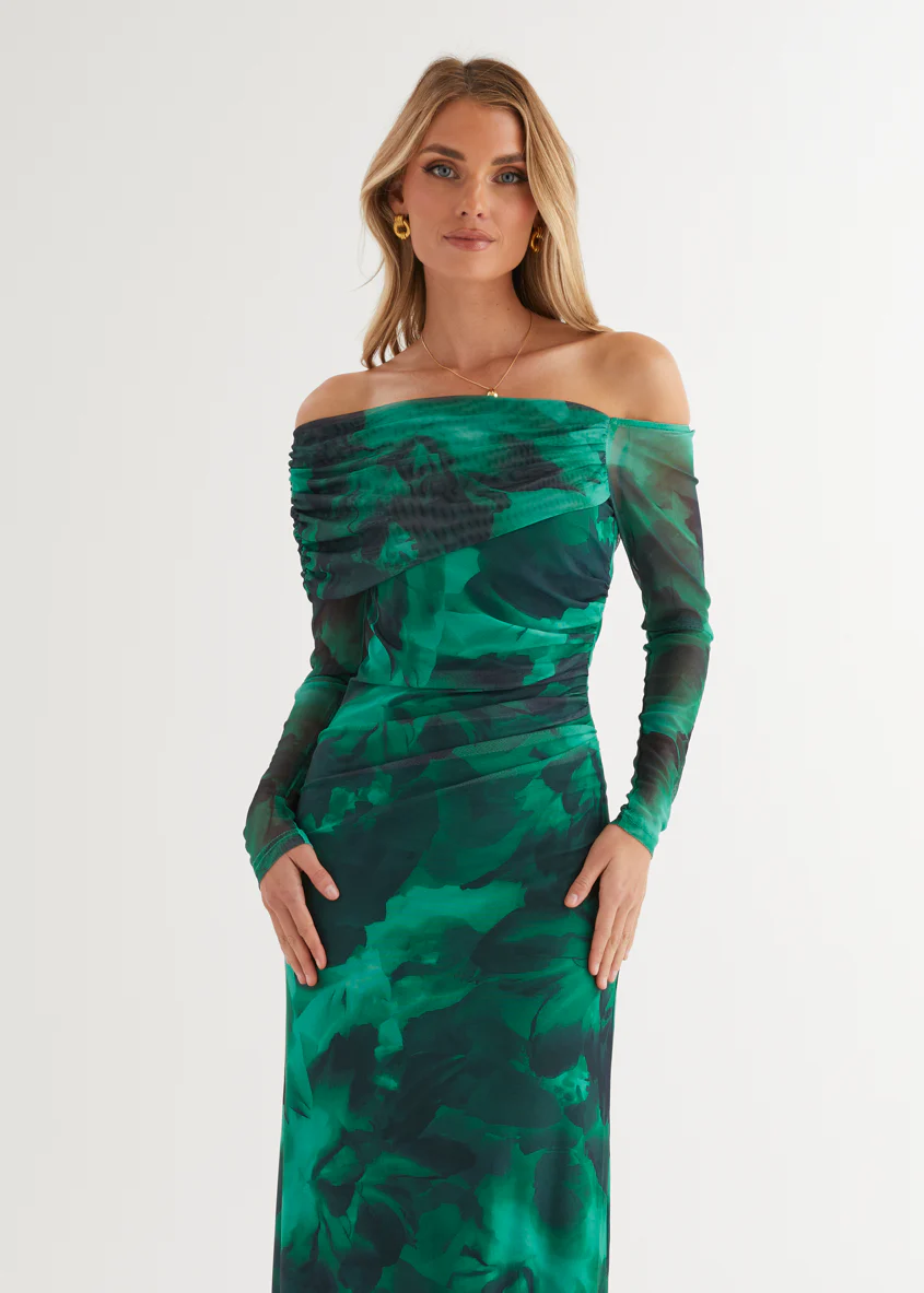 Nix Off Shoulder Maxi Dress - Emerald Watercolour