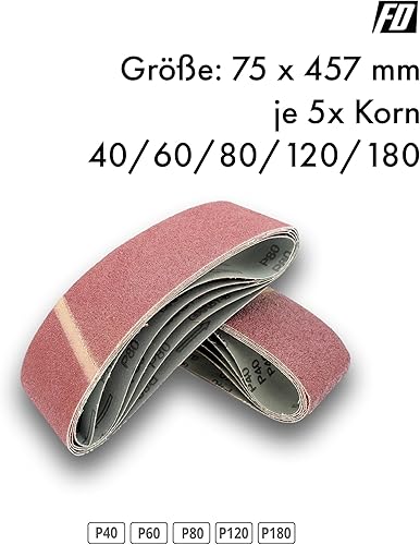 Nastri Abrasivi in Tessuto │ 25 pezzi │ 75 x 457 mm │ Mixpack (5 x grana 40/60/80/120/180 ciascuno) │ per levigatrici a nastro │ Carta Abrasiva │ Set di Nastri Abrasivi