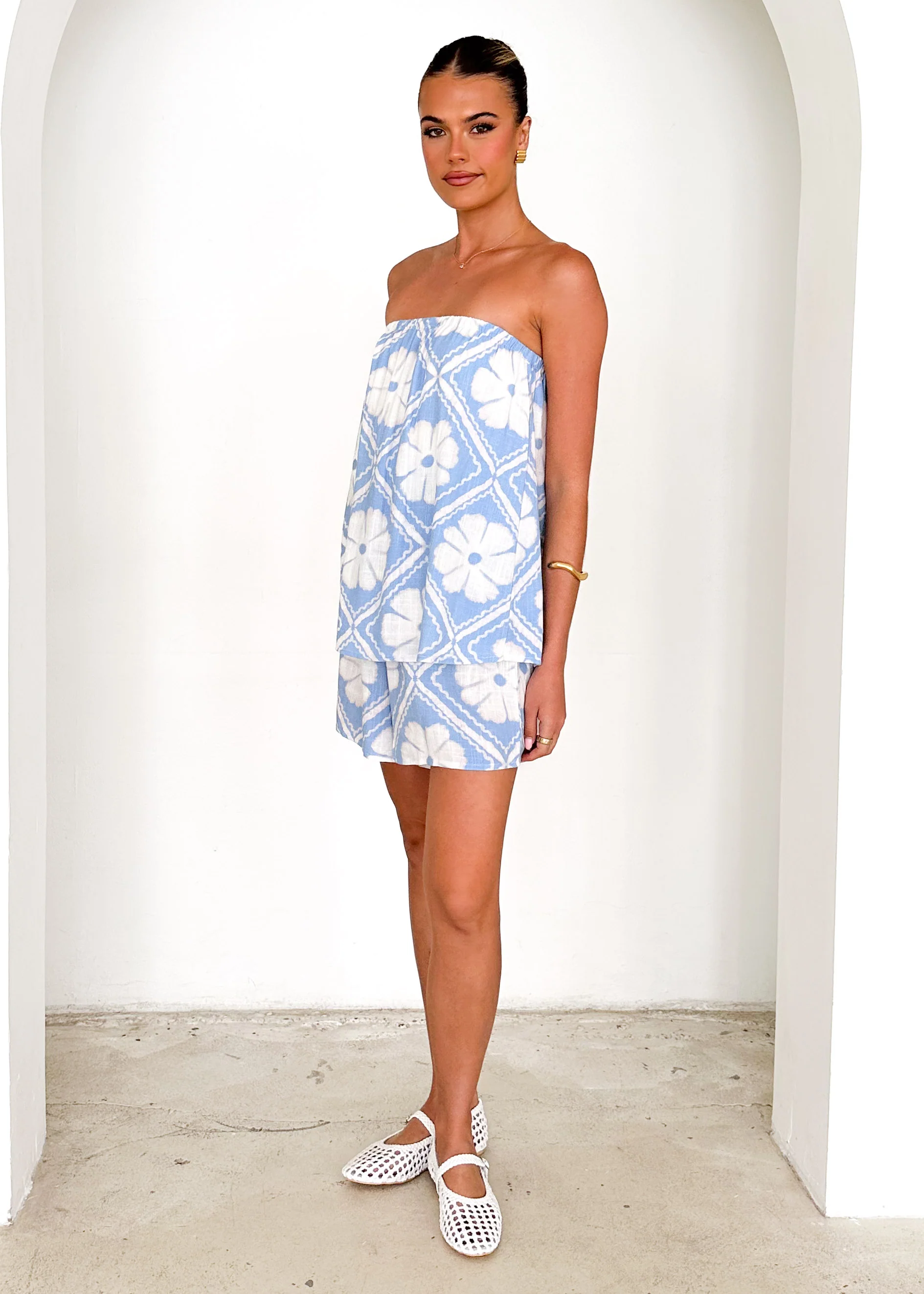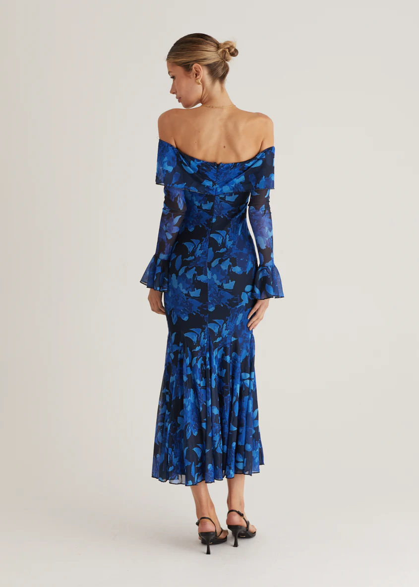 Linier Off Shoulder Mesh Maxi Dress - Blue Floral