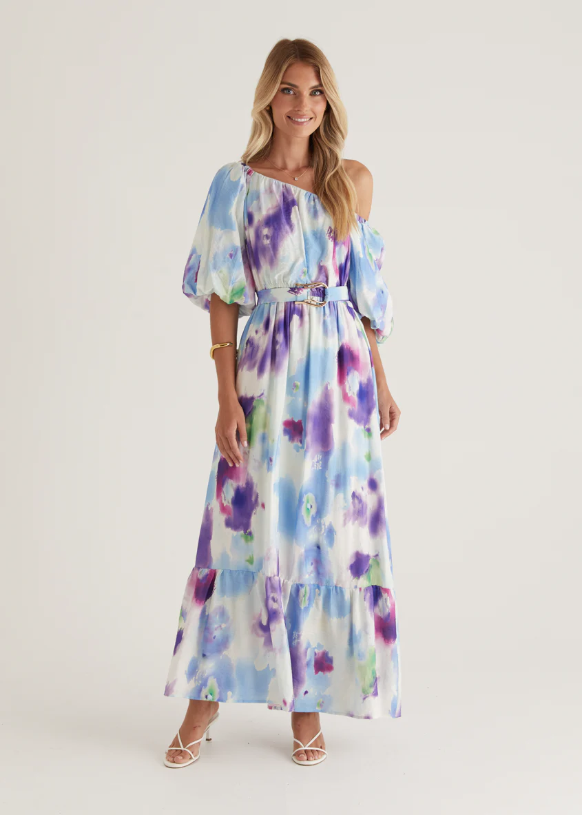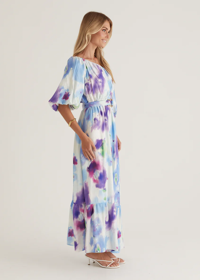Halia Off Shoulder Midi Dress - Violet Watercolour