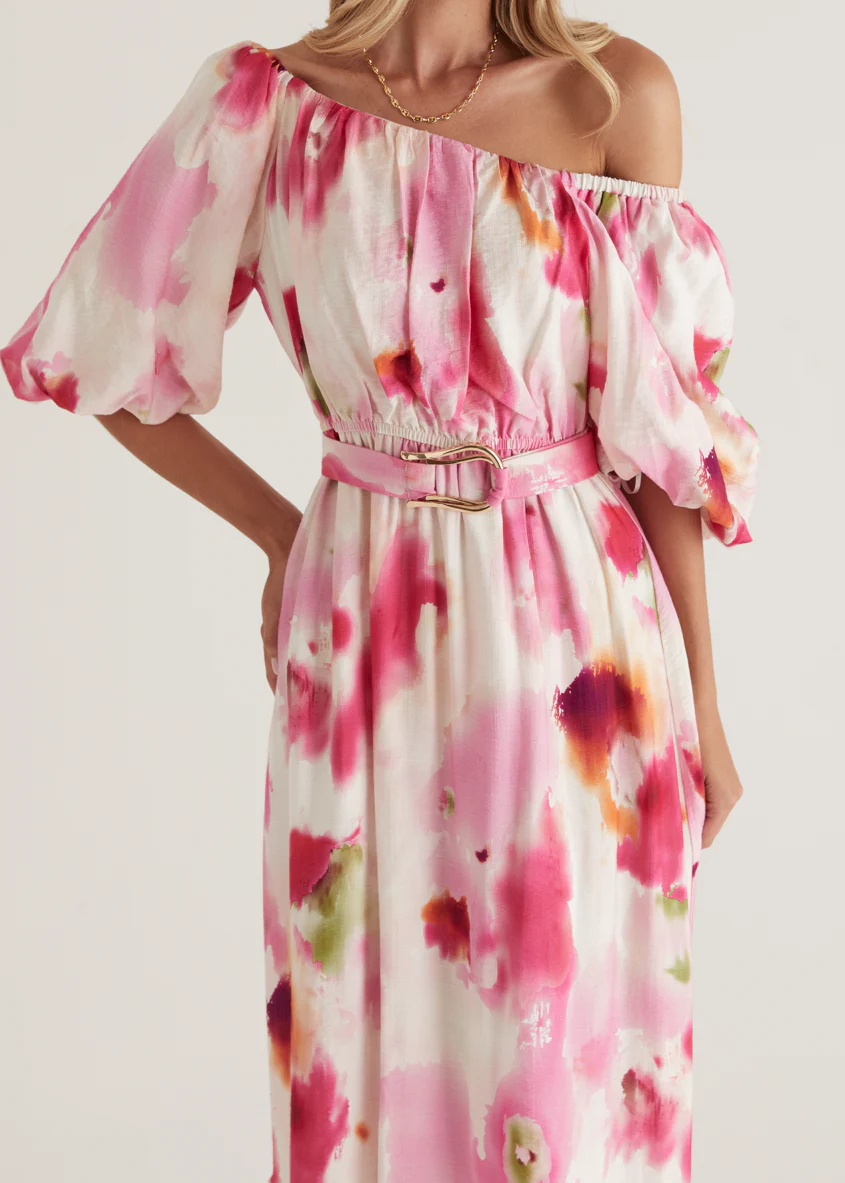 Halia Off Shoulder Midi Dress - Pink Watercolour