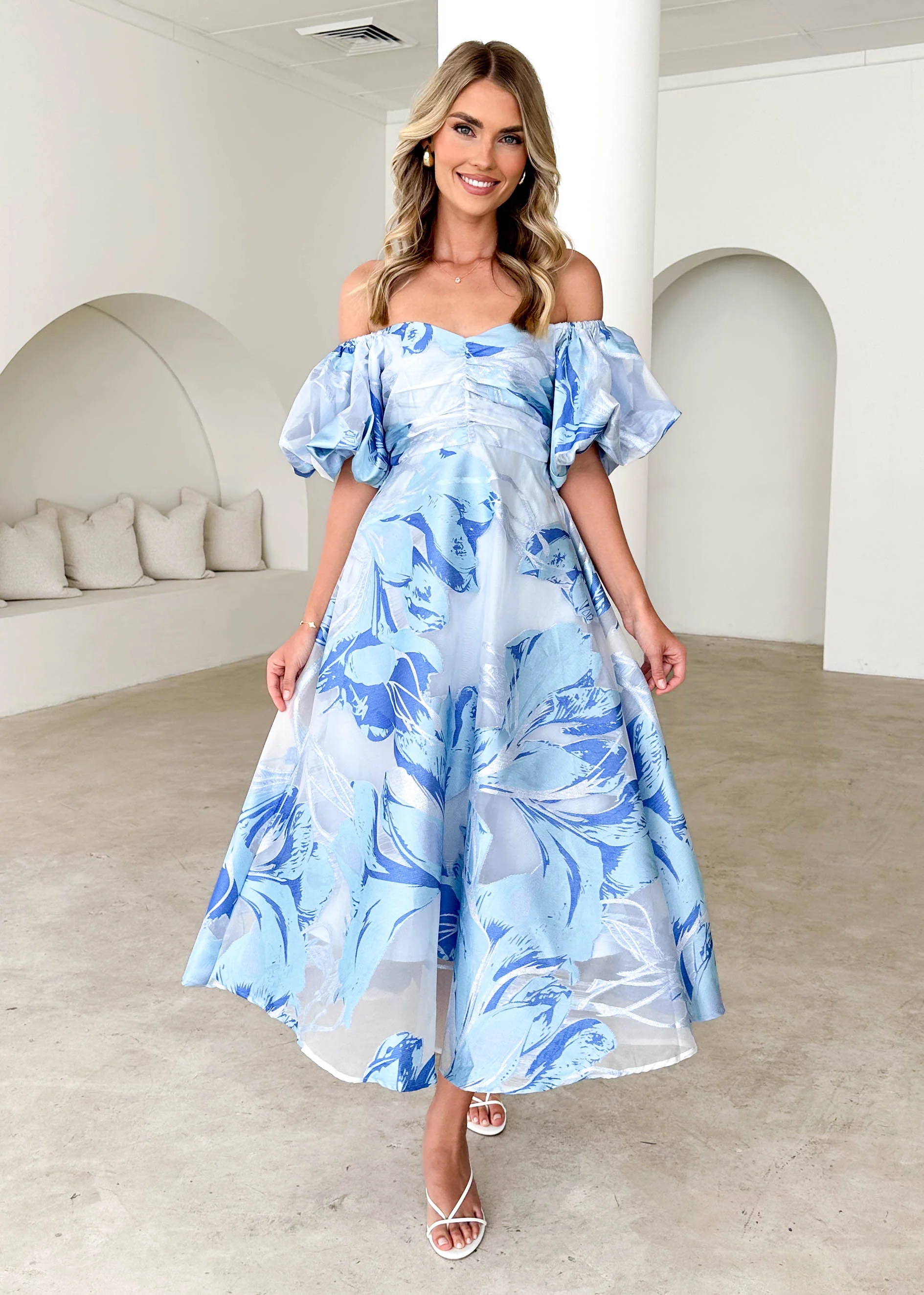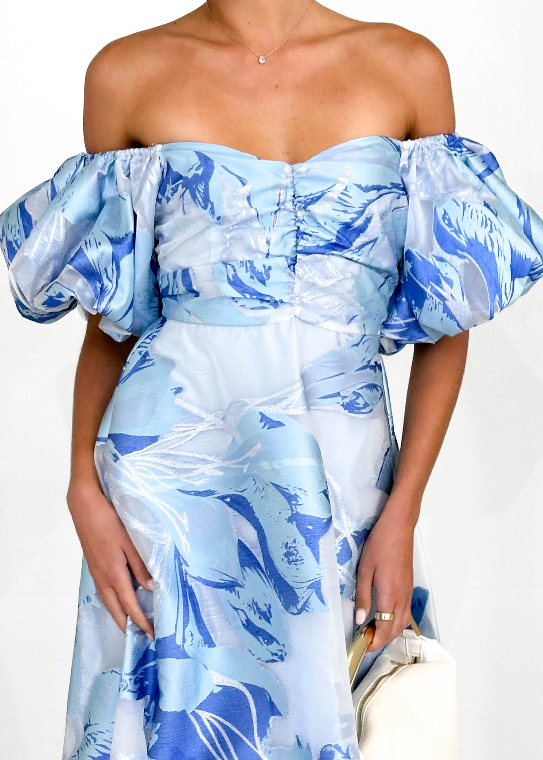Anaya Off Shoulder Midi Dress - Sky Jacquard