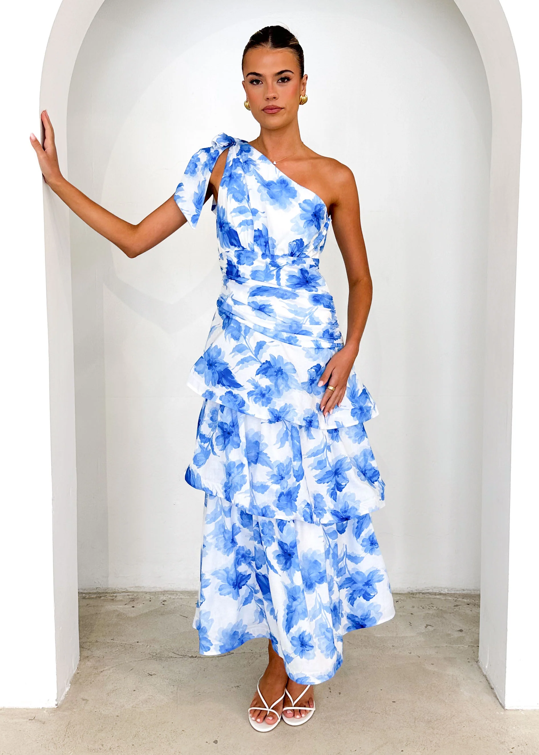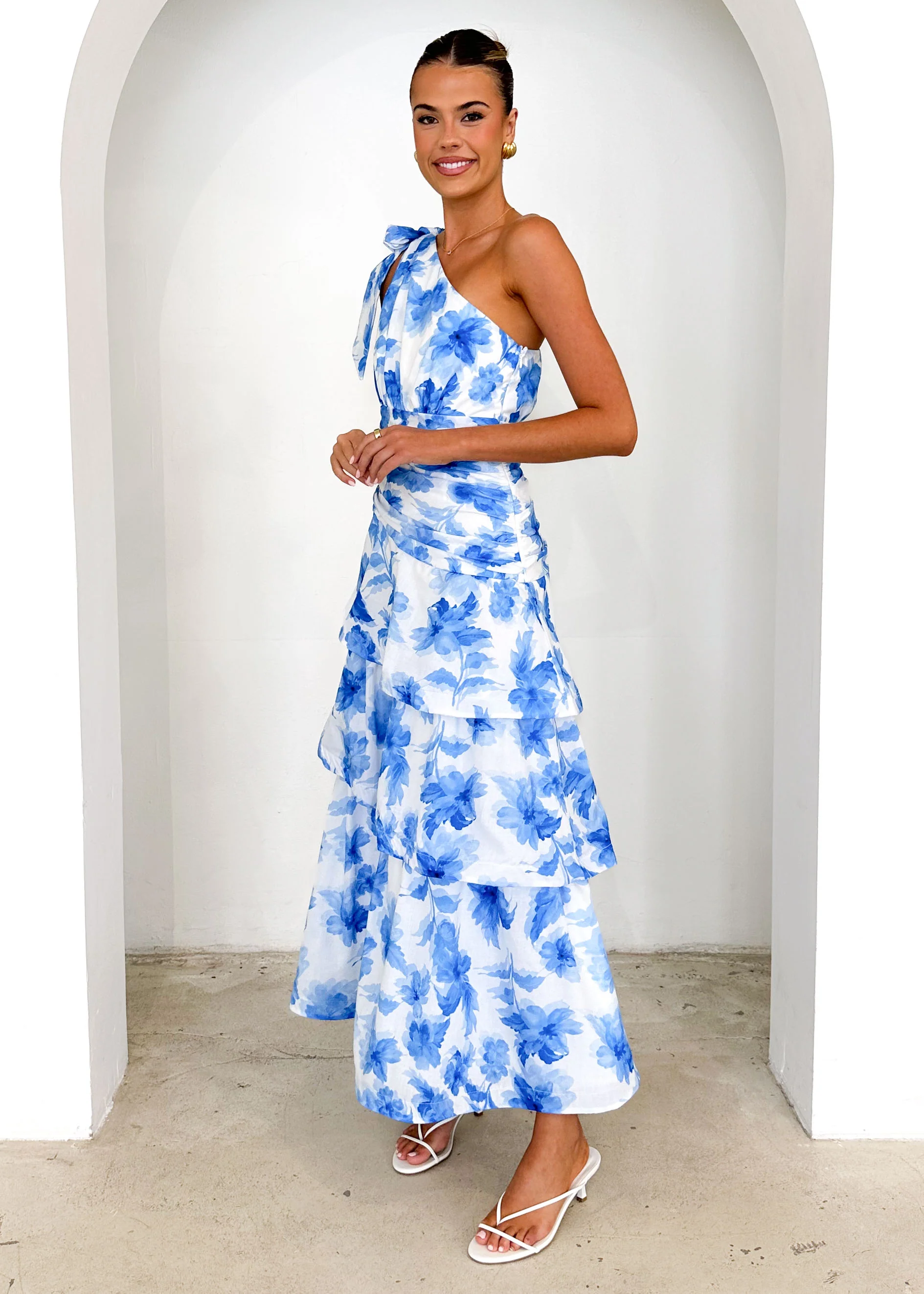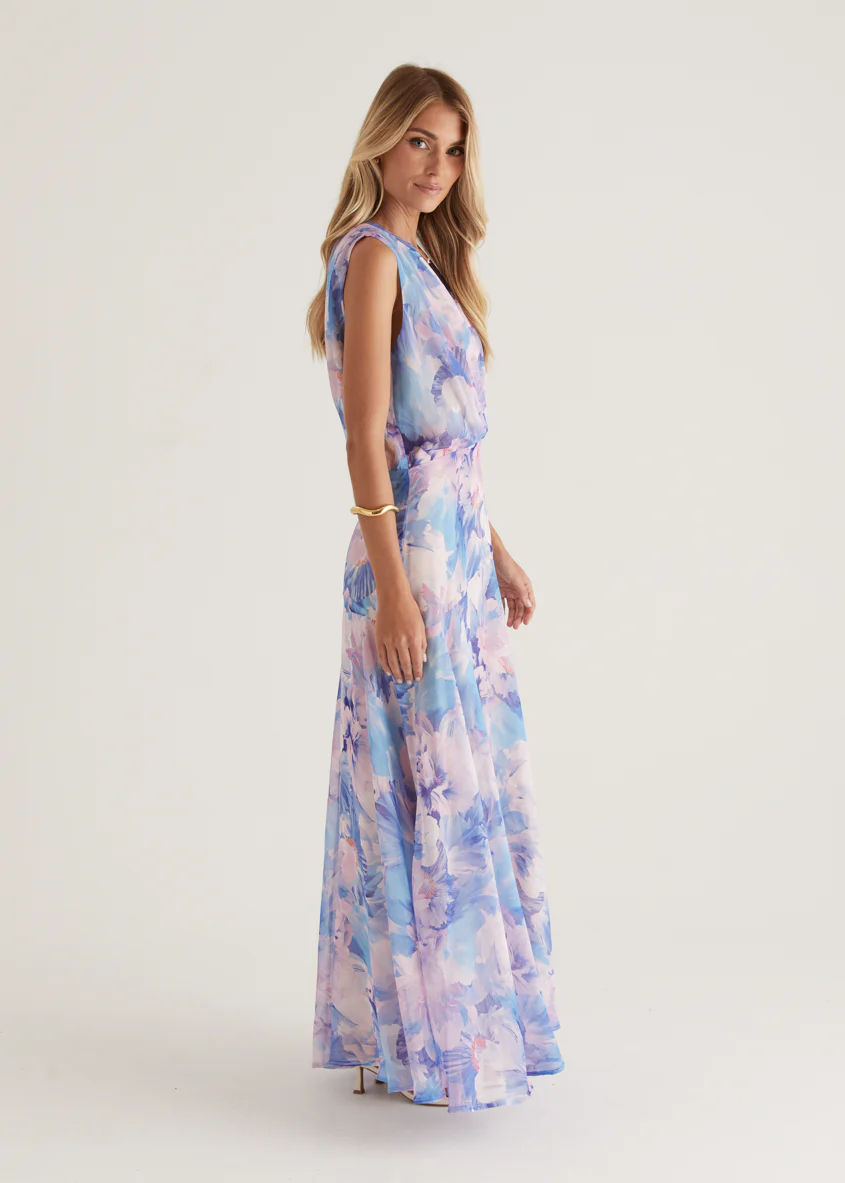 Anrielle One Shoulder Maxi Dress - Blue Flowers