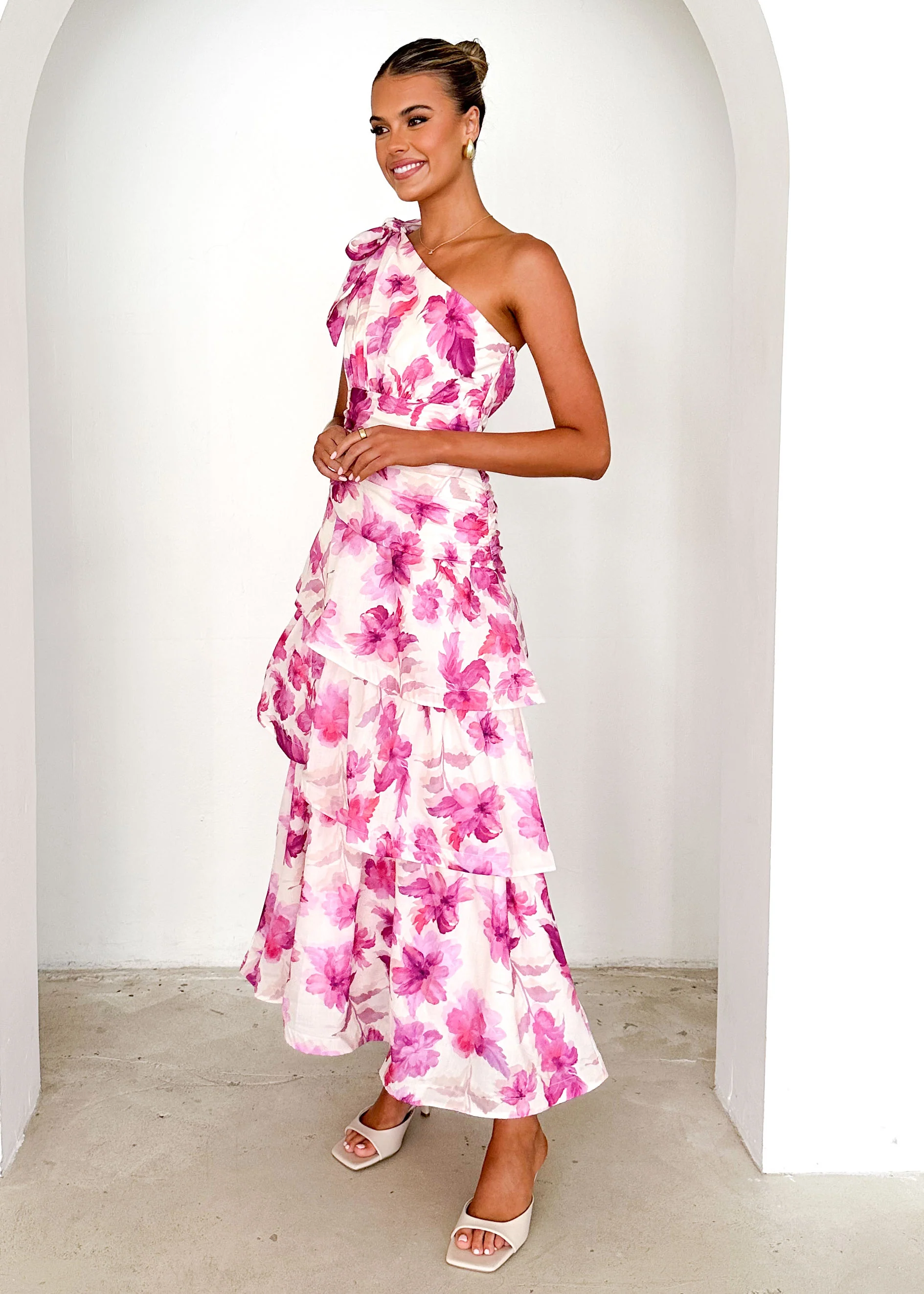 Anrielle One Shoulder Maxi Dress - Pink Flowers