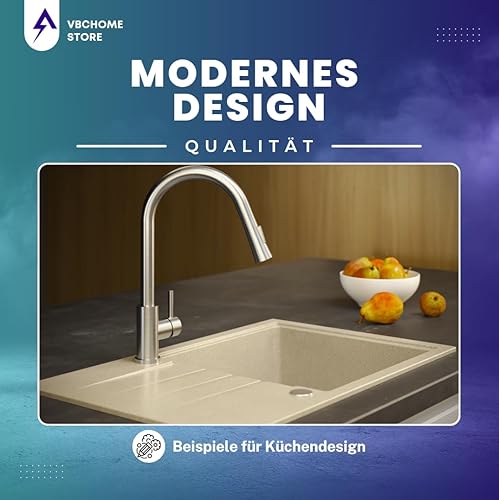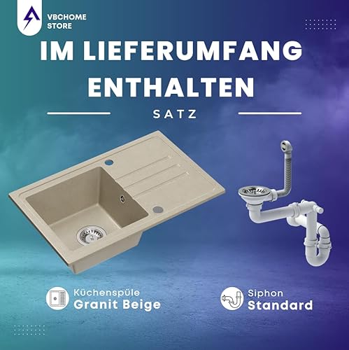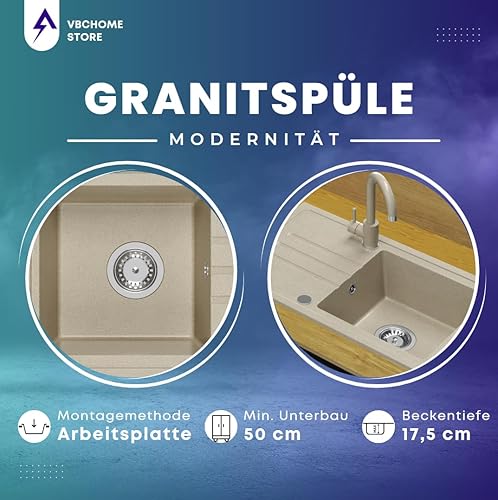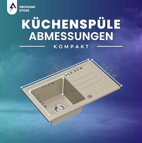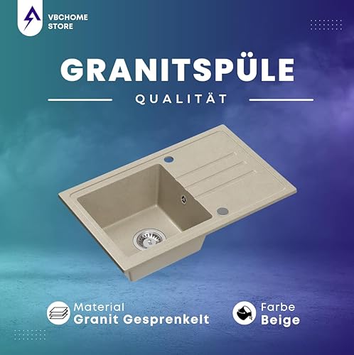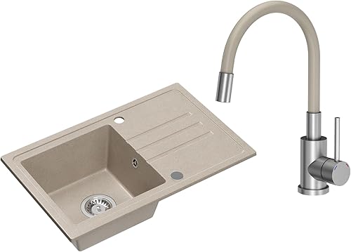 Lavello in granito beige con rubinetto, 70 x 44 cm, lavello singolo da incasso screziato, reversibile, in granito